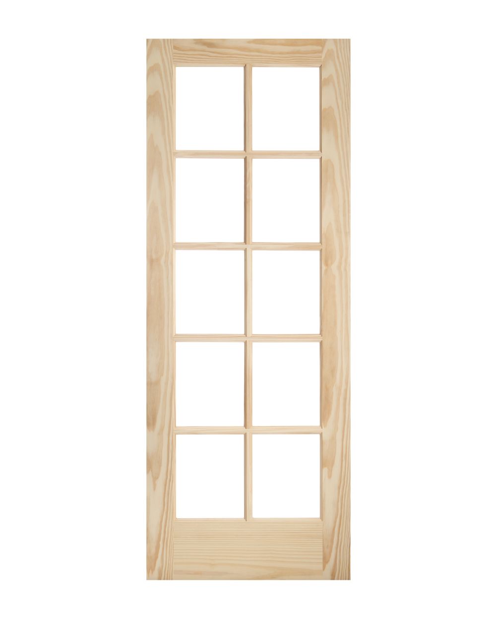 This French door features a 10-lite design on 1 3/8" thick pine. The 10-lite door works perfectly for either a single or double door opening. The clear pine material can be finished using a rich stain or a clear top coat for a natural look.